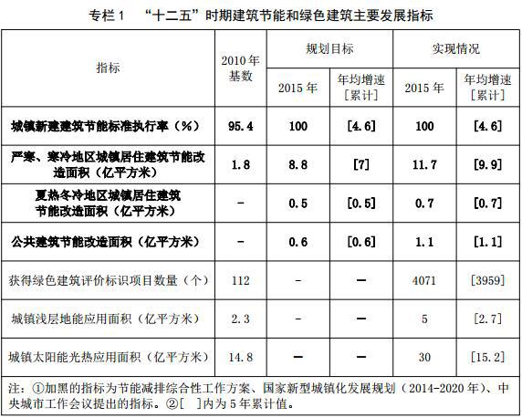 “十二五”时期,我国建筑节能和绿色建筑事业取得重大进展,建筑节能标准不断提高,绿色建筑呈现跨越式发展态势,既有居住建筑节能改造在严寒及寒冷地区全面展开,公共建筑节能监管力度进一步加强,节能改造在重点城市及学校、医院等领域稳步推进,可再生能源建筑应用规模进一步扩大,圆满完成了国务院确定的各项工作目标和任务。