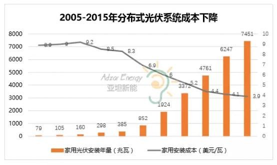 从2007年开始,分布式光伏系统成本开始下降,12年内下降了70%,而目前的安装成本为家用¥20/瓦,工商业¥11/瓦,投资回收期为3-8年。