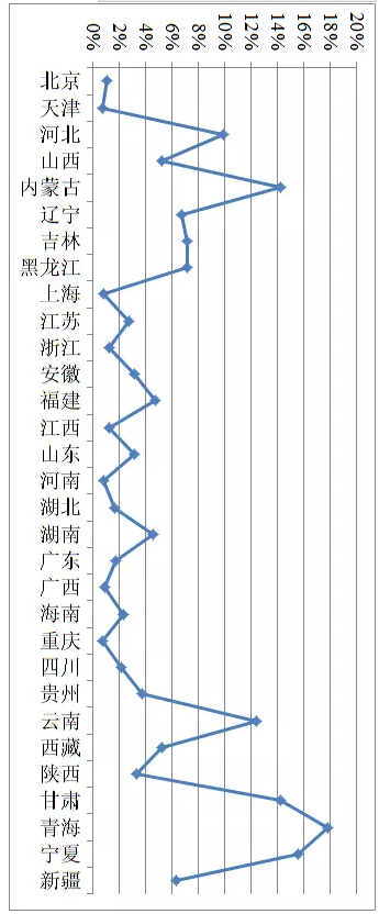 云南、内蒙古、甘肃、宁夏、青海5省高于10%,在12.4%~17.8%之间;