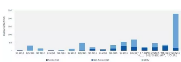来源:国际能源小数据发布时间:2017-03-22 09:11:59 根据GTM Research发布的数据,2016年美国储能应用规模达到336兆瓦时(MWh),比2015年的水平翻了一番,其中97%为锂电池。2016年储能数据如此靓丽,主要是因为2016年第四季度的储能大跃进:当月新增储能213兆瓦时,比前12个季度的总和还多!而这一惊人成绩又主要是一个州的功绩:2016年第四季度的新增储能中有88%来自加利福尼亚州,主要是紧急采购储能容量应对亚里所峡谷天然气田泄露事件造成的尖峰时刻电力短缺。