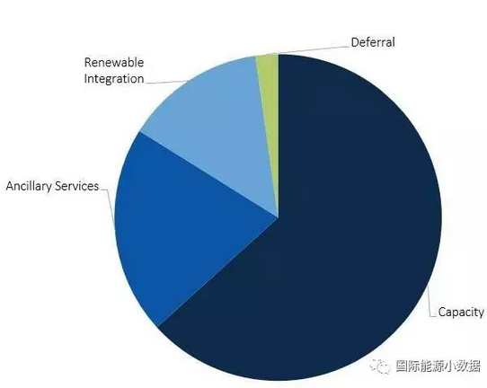 从储能技术应用的领域来看,25%为“电表后”的居民储能。而 “电表前”的储能技术的应用也渐趋多元和成熟,不再局限于辅助服务和可再生能源吸纳,而是开始“挑大梁”为电网提供容量。因此,在一定的储能容量(MW)情况下,储能的产出(MWh)更高,这是美国储能技术应用的一个转折点。