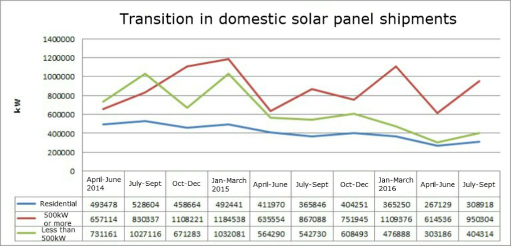 索比光伏网讯:自2012年日本祭出“再生能源特别措施法案”高价收购太阳能发电以来,日本光伏市场发展迅猛。不过随着日本逐年调降太阳能收购价格,市场衰退趋势明显。2016年受内需萎缩影响,日本光伏市场已连续7季衰退,相关企业相继败退、破产件数更创历史新高。