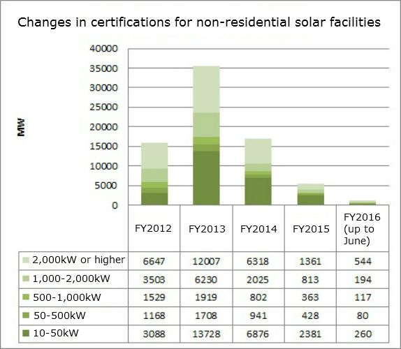 许多开发商忙于FIT计划初期认证的项目建设,2012年至2014年度认证的高关税项目在市场上交易,这也导致了新认证规模的下降。