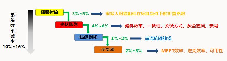 光伏系统中,能量从太阳辐射到光伏组件,经过直流电缆、汇流箱、直流配电到达逆变器,当中各个环节均有损耗,大概10-16%之间(如下图所示)。也就是说,在组件容量和逆变器容量相等的情况下,由于客观存在的各种损耗,逆变器实际输出最大容量只有逆变器额定容量的90%左右,即使在光照最好的时候,逆变器也没有满载工作,降低了逆变器和系统的利用率。