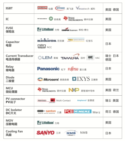 小三相机虽然质量减轻,但是质量以及性能却进行了大幅提升,内部元器件皆选择国外知名品牌,IGBT选择仙童、英飞凌、威科;IC选择安森美、德州仪器;保险丝选择力特、库柏-博仕;电容选择尼吉康,红宝石,NCC;电流传感器选择莱姆、田村、VAC;继电器选择松下、富士通等。这些国外知名品牌的元器件不仅保证了产品的性能还保证了产品的质量,间接提高整个光伏系统的使用寿命。