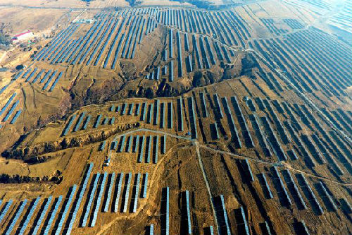 资料图:俯瞰山西大同采煤沉陷区光伏示范基地大同京能10万千瓦光伏项目一角。