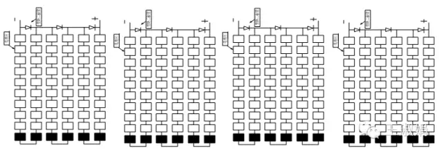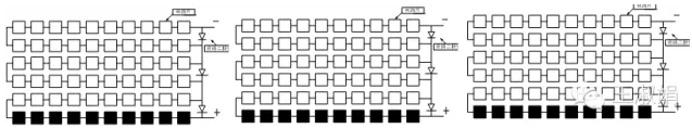 当组件纵向排布时,阴影会同时遮挡3个电池串,3个二极管若全部正向导通,则组件没有功率输出,3个二极管若没有全部正向导通,则组件产生的功率会全部被遮挡电池消耗,组件也没有功率输出。