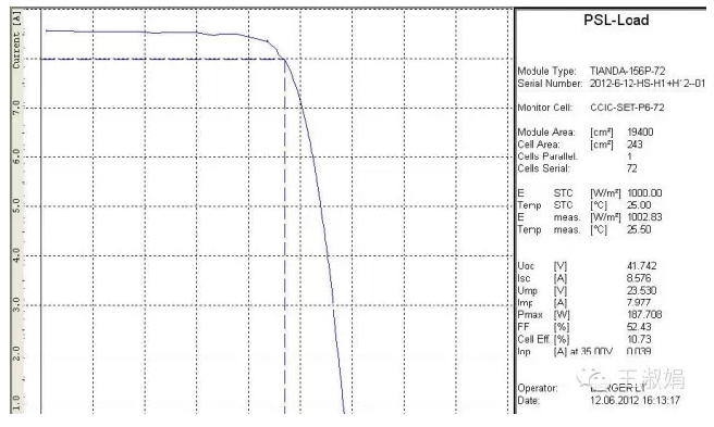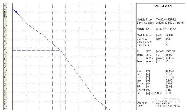 从图中可以看到,组件横向遮挡电池片时,组件的输出功率约为正常输出功率的2/3,说明二极管导通,起到保护作用,组件纵向遮挡电池片时,组件几乎没有功率输出,测试结果与理论一致。