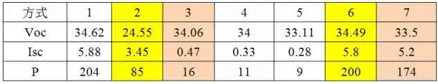 这7种遮挡方式中,方案2和方案6、方案3和方案7的遮挡量基本相同。那他们的输出功率呢?看下表。