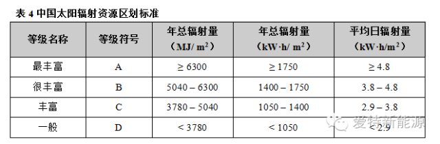 《太阳能资源等级 总辐射》(GB/T 31155-2014)中,根据总辐射量将太阳能资源等级划分为4个等级,如下所示。