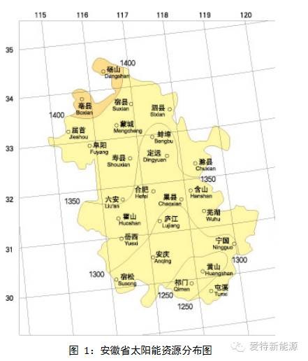 安徽省太阳能资源空间分布趋势为北高南低,砀山县、亳县的太阳能资源最好;由此向南,随着云雨天气的增多,总辐射量随之减少。安徽的太阳能水平面总辐射量在1250~1400kWh/m2之间,属于太阳能资源“丰富”地区。