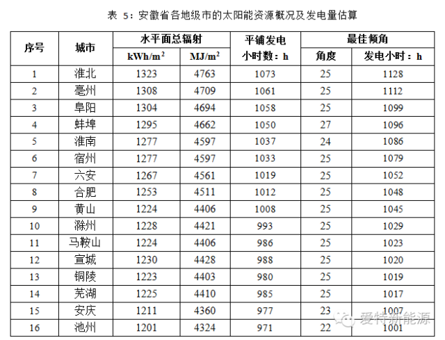 根据Meteonorm的数据,安徽省16个地级市的水平面年总辐射量、发电小时数估算如下表所示。