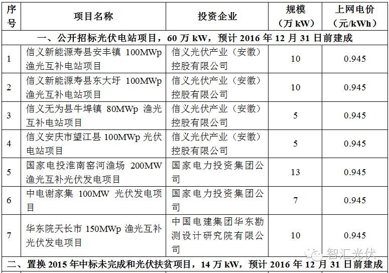 国家给安徽省2016年普通光伏项目的指标为100万kW,2016年9月14日,安徽省能源局下发《安徽省能源局关于下达2016年地面光伏电站项目建设规模的通知》(皖能源新能〔2016〕57号),将2016年普通光伏项目规模指标分成三部分,分别为: