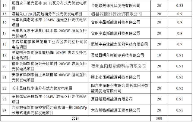 鉴于上述情况,安徽省能源局在2016年底增补了24个项目,累计500MW,解决了一部分项目的指标问题。