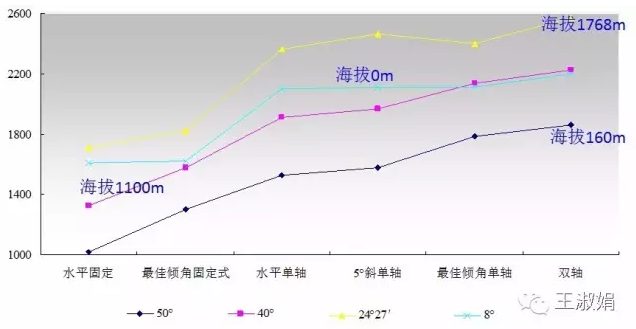 在低纬度地区,通过对方位角的跟踪,提高早晚的发电量会有较好的效果;而在高纬度地区,通过对高度角的跟踪,提高不同季节的发电量,会有较好的效果。这从固定可调式的数据也可以看出。
