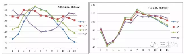 图9:高纬度、低纬度采用不同倾角时发电效果模拟