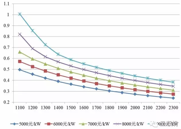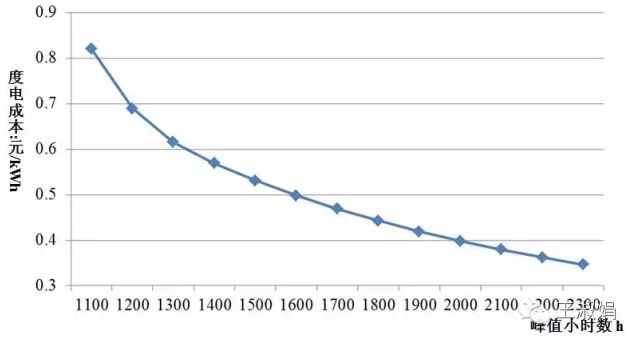 下图为初始全投资为8000元/kW时,不同峰值小时数对度电成本的影响。