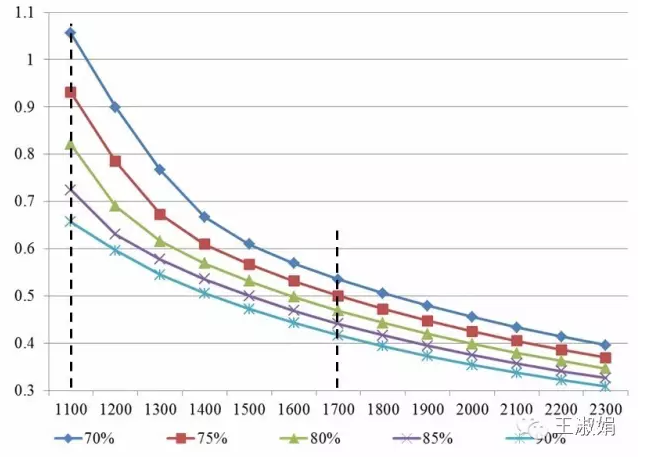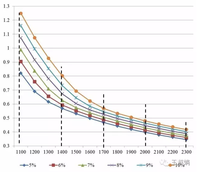 从上图中可以看出,由于我国不同地区的峰值小时数跨度大,度电成本差异也非常大,1100h时为2300h时的2.4倍!