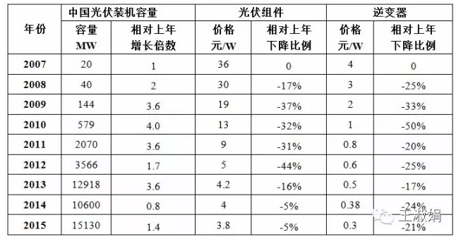 虽然由产量到装机量受出口因素影响,又成本到价格受市场因素影响,但从上表可以看出,光伏组件、逆变器的价格下降随装机容量的变化,基本符合Swanson定律。