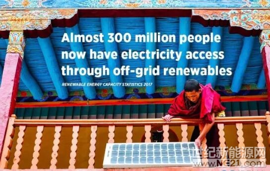 今年也是IRENA第一次将离网可再生能源相关数据纳入此报告。截至2016年底,离网型可再生能源发电容量达到了2800MW。其中约40%来自太阳能,10%来自水能。其余最大比例则来自生物质能。据估算,全球有多达六千万户家庭(或3亿人口)由此获益。