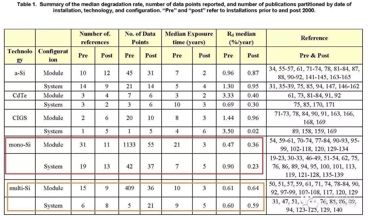 2012年6月,美国NREL实验室出了一份关于光伏组件衰减的研究报告《Photovoltaic degradation rates-An analyticalreview》。该报告中的数据并不是作者的实验数据,而是对之前大量文献中报道的组件衰减率数据进行了统计和分析。