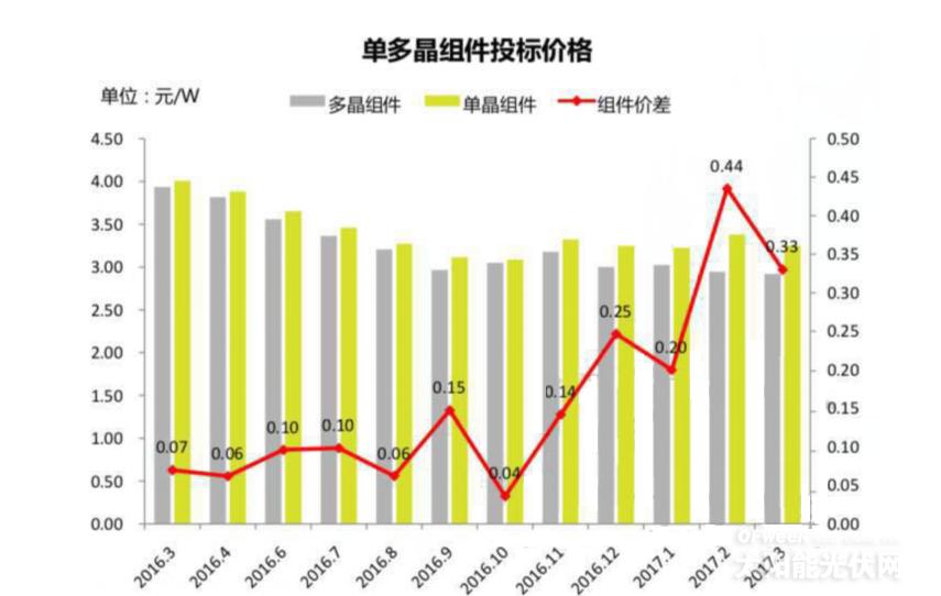 2016-2017年单多晶组件投标价格统计图