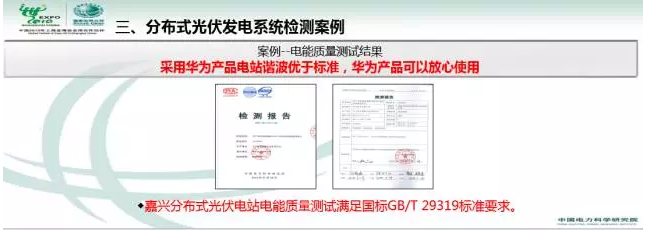 无功补偿是分布式并网的一个大问题。此前某分布式光伏项目,选择了无法实时做无功补偿的逆变器,被迫缴纳力调电费,1MW电站每月被罚款2121元,被罚款额高达发电收益的10%。而智能光伏逆变器自身能够做无功补偿,系统功率因数优于电网要求,彻底消除罚款隐患。中国电科院包斯嘉在会上介绍到:华为率先顺利获得了电科院的无功补偿及电能质量测试检测报告,电站并网技术性能优异,谐波优于标准,华为逆变器可以放心使用。