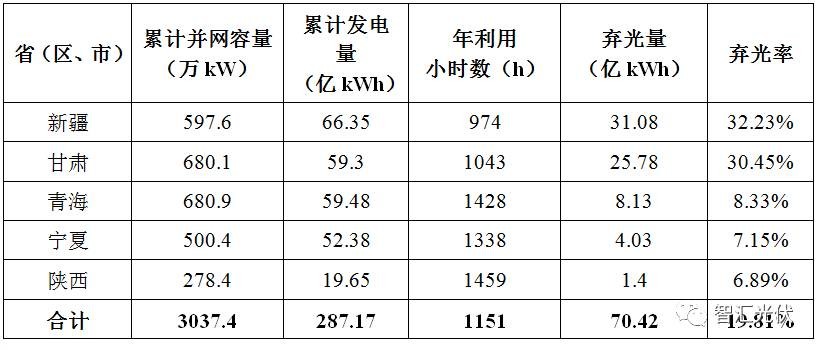 2016年,西北五省(区)新增光伏发电并网1011万kW,累计并网3037万kW,占全网总装机的13.8%。2016年,光伏发电量287.17亿kWh,占全网总发电量的4.57%;利用小时数1151h,弃光电量70.42亿kWh,弃光率19.81%。