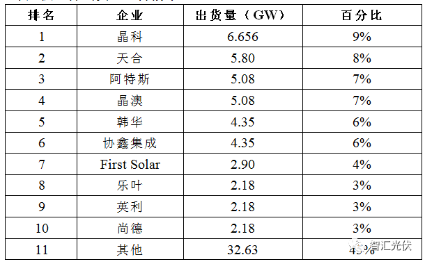 根据Energy Trend 的统计数据,2016年全世界光伏组件出货总量为72.5GW。出货量前10名的企业如下表。
