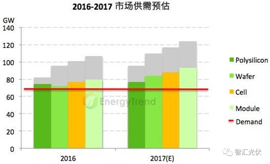 据预测,全世界一、二线企业的产能已经能完全覆盖住现有市场需求。然而,2017年仅中国本土电池片产能就将有约10GW的扩充,供过于求局面严重将增加企业的价格压力。
