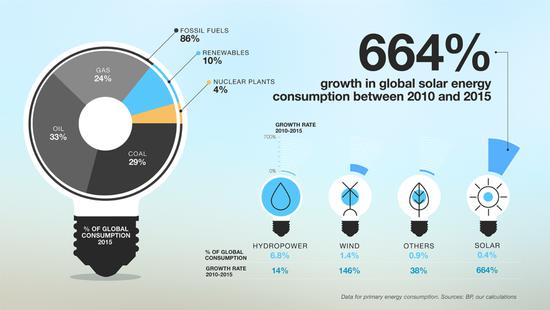 图:664%——在2010年到2015年之间,全球太阳能消费增长664%