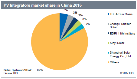 中国五大EPC公司在2016年安装了5.2GW,占总市场份额的17%,2015年前五名的市场份额为29%。2016年,中国非住宅光伏需求同比增长了68%,刺激了小公司的增长,并吸引了新进入者。