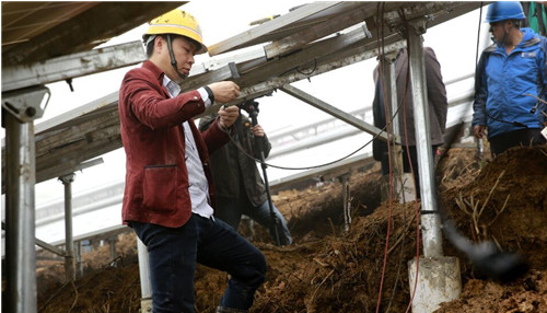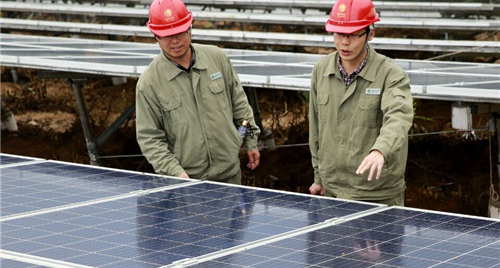 4月8日,湖北省秭归县茅坪镇溪口坪村光伏电站并网发电,工作人员做最后的调试检查。