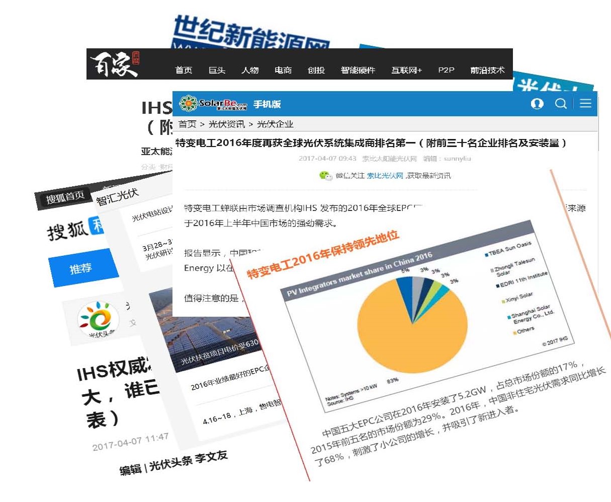 搜狐、今日头条、能源发展网、一点资讯、SolarBe索比光伏网、国际能源网、世纪新能源网、能源圈、北极星光伏网、光伏时代、Solarzoom、PVnews、中国分布式能源网、第一电桩等近二十家行业主流媒体进行了相关报道,特变电工新能源公司再次摘得“光伏EPC全球第一”桂冠,消息传遍光伏圈。