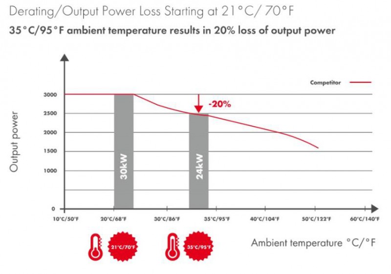 廉价的逆变器经常会在环境温度21℃时就有输出功率损失,它们无法处理光照下功率损失问题。