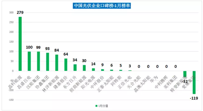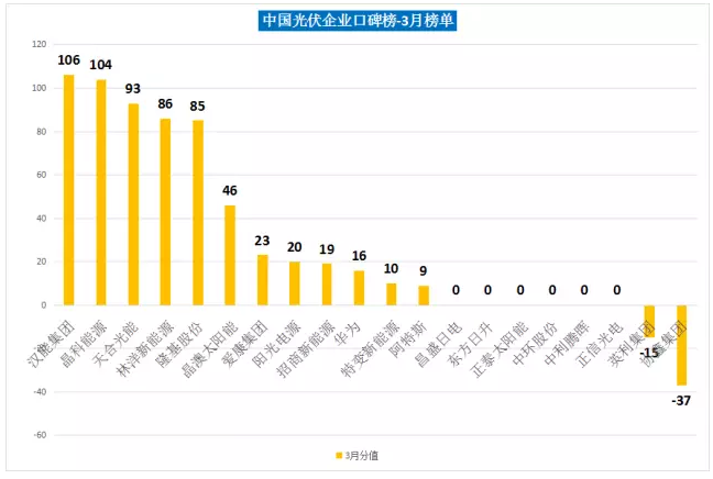 一季度,20家光伏样本企业口碑总分值为1715。非常可惜的是,由于光伏企业口碑榜推出较晚,我们没有同比数据可供参考。但以我们的经验而言,这个数值并不低。