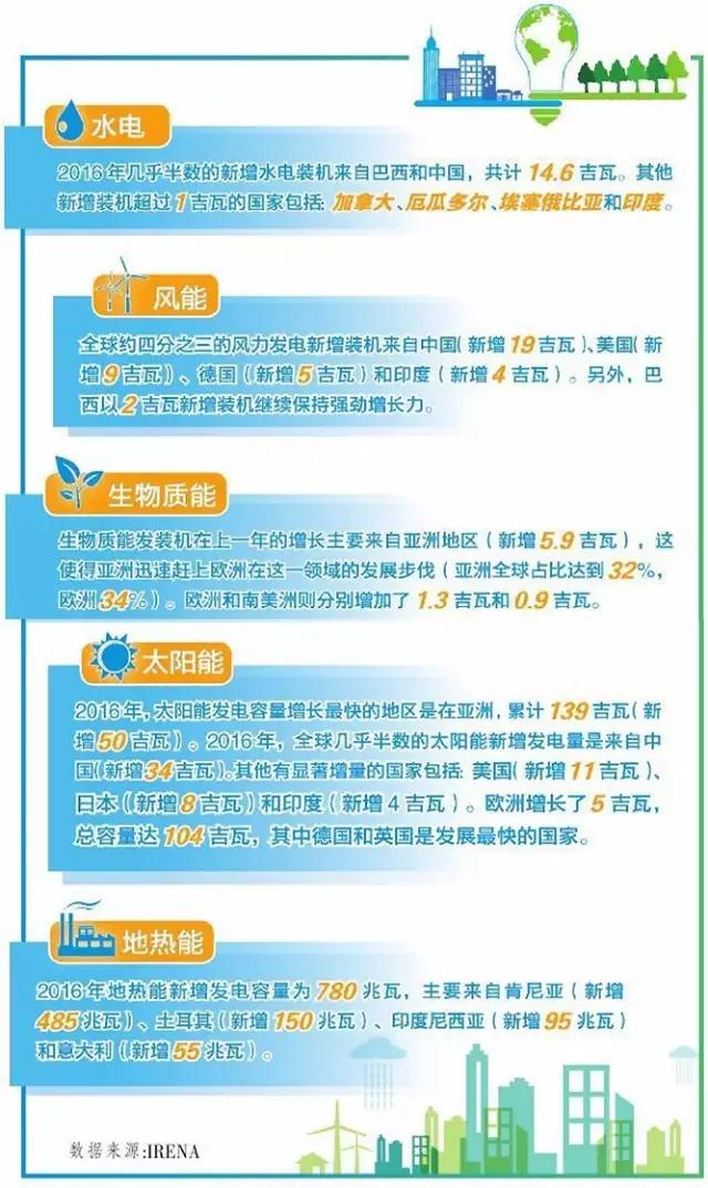 最新数据显示,2016年全球可再生能源发电新增装机161吉瓦,增长8.7%。