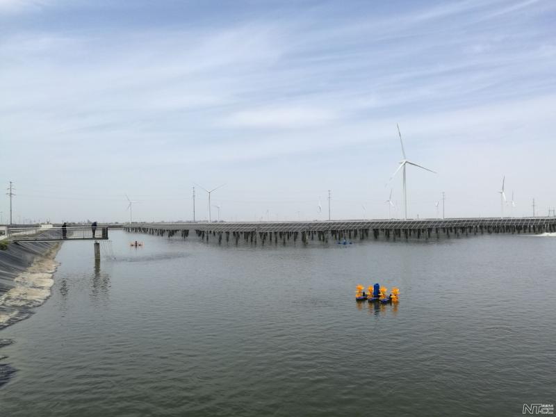 波光粼粼的池塘下面,规模化养殖着鱼虾,即使管理人员身在北京,也可实现智能化即时监控;池塘水面的上方,高高架设着大面积的光伏发电设施。由如东通威新能源公司投资建设的“渔光互补”项目,成功实现渔业生产和光伏发电两不误,这种集约利用土地的发展模式受到王广华的高度评价。