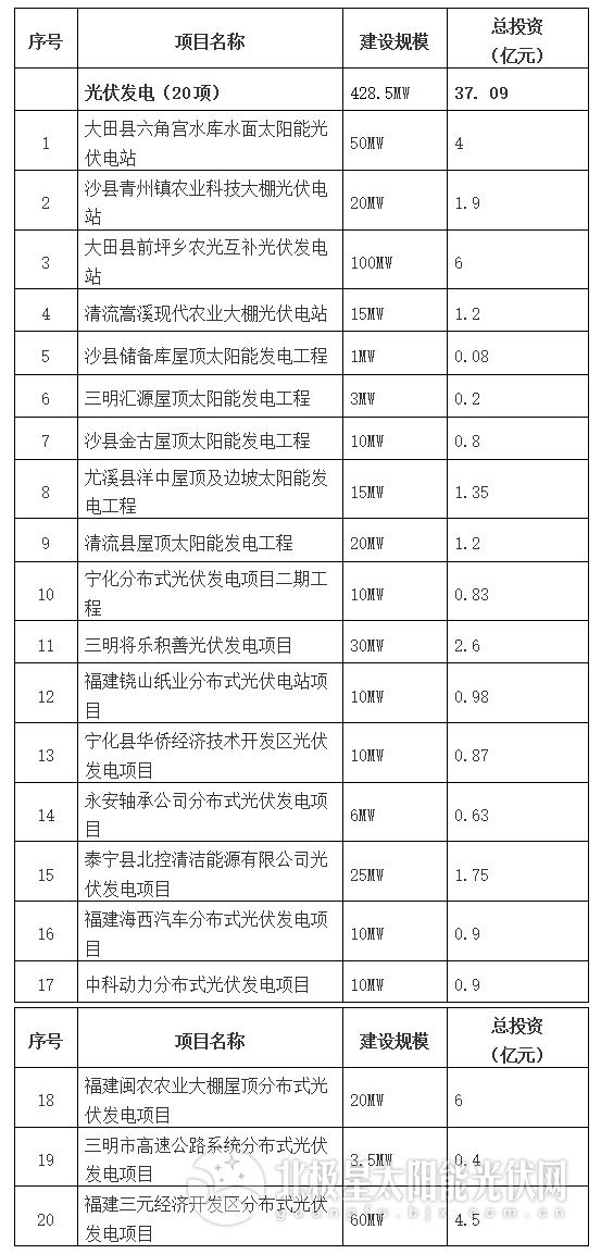 索比光伏网讯:近日,三明市人民政府办公室关于印发三明市“十三五”能源发展专项规划的通知,规划罗列了能源建设的重点项目共72项,包括核电、光伏发电、风力发电、水力发电、火力发电、变电站、天然气、煤矿及电动汽车充换电基础设施等项目。其中指出,“十三五”期间规划光伏发电项目20个,共428.5MW,计划总投资37.09亿元。