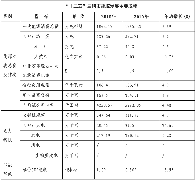 “十二五”期间,三明市能源项目建设、供应能力、运行保障能力大幅提升,能源惠民、结构调整、节能减排和优化发展环境成效显著,为今后经济社会快速发展和人民生活水平稳步提高奠定了坚实基础。