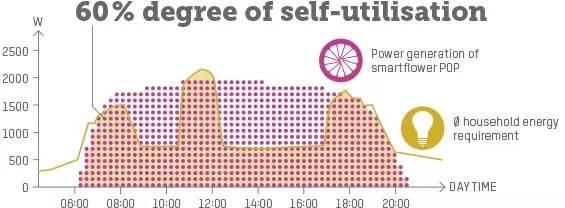 值得一提的是它的家庭电能匹配算法。大型电网最为头疼的问题就是太阳能发电的巨大波动性有可能对电网造成短时冲击,而Smartflower可以主动通过调节照射角度,将发电量与家庭用电量相匹配。