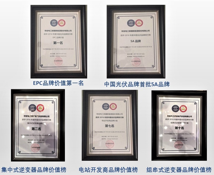 在PVBL2016年度中国光伏品牌排行榜颁奖盛典上,特变电工新疆新能源股份有限公司分别荣获:2016年度中国光伏品牌排行榜EPC品牌价值第1名、20集中式逆变器品牌价值第2名、组串式逆变器品牌价值第10名、电站开发商品牌价值第7名,并荣获首批5A品牌。