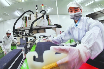 24日,在南安市阳光中科新投产的二期项目厂房里,工人们在自动化生产线上作业。 阳光中科(福建)能源股份有限公司是我省太阳能光伏行业龙头企业,今年新投产的二期单晶硅太阳能电池年产能可达700MW。