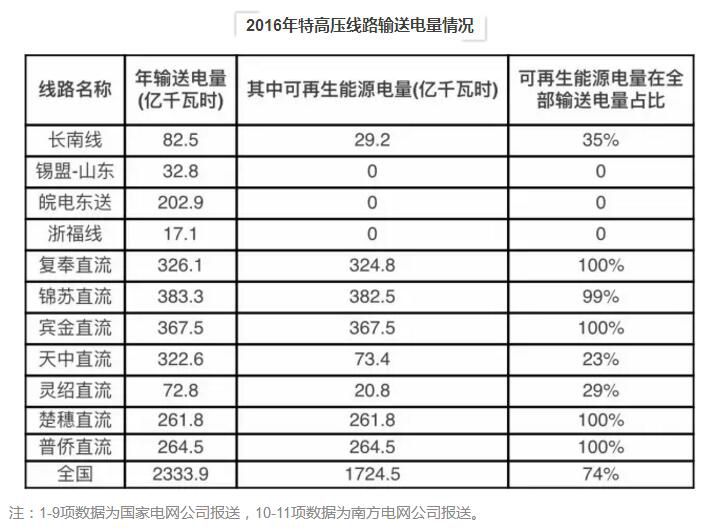 索比光伏网讯: 4月18日,国家能源局发布了《2016年度全国可再生能源电力发展监测评价报告》(以下简称《报告》),分省份公布了可再生能源消纳情况及风电、光伏发电保障性收购落实情况,信息量可谓不小。当大家都在关心哪个省份垫底时,笔者却被报告末尾的“特高压输送可再生能源情况”抓住了眼球。这是国家战略性发展特高压以来第一次公布特高压线路输送电量情况,结合笔者之前做过的特高压线路信息梳理,有几个数字还是挺值得解读的。