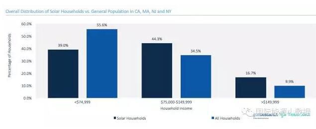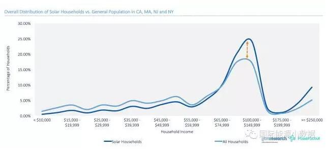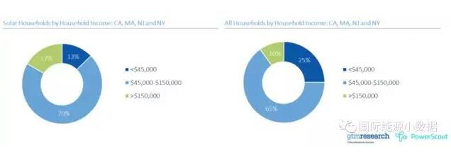 那么,屋顶光伏是不是真的只是富人“玩具”?GTM Research和PowerScout公司针对这一问题对美国加利福尼亚、马萨诸塞、新泽西、纽约四个州的50多万户屋顶光伏用户(“光伏家庭”)进行统计分析,得出以下结论: