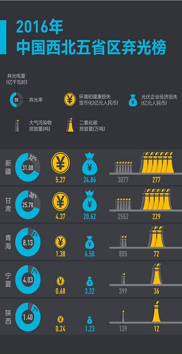 不过,中国绿色和平组织也点出西北五省的弃光问题未获解决。据其统计,2016年西北五省的弃光量较2015年增加了50%,规模接近法国2015年的全年发电量,造成环境与健康损失12亿元、企业经济损失更达56亿元。