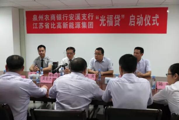 为促进光伏产业健康发展,加大绿色信贷支持力度,践行社会责任,推进精准扶贫工作,助推农民增收致富。4月26日上午,泉州农商银行联合江苏省比高新能源集团在安溪县举行“光福贷”启动仪式。安溪县领导洪龙、泉州农商银行党委委员吴志民、比高新能源集团副总裁谢雄伟、安溪县支行副行长(主持)吴宏杰等参加了启动仪式。启动仪式现场,泉州农商银行安溪县支行向80位农户授信“光福贷”1200万元,并当场发放“光福贷”12笔,金额180万元。