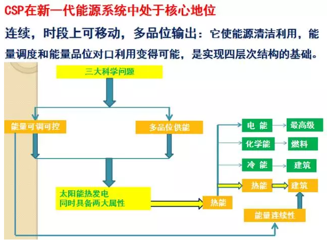 国家太阳能光热联盟常务副理事长王志峰和浙江大学博士生导师肖刚合作完成的《太阳能热发电在新一代能源系统中的定位》报告指出:要定位好太阳能热发电的作用,首先要定位好可再生能源在新一代能源系统中的核心地位。因为电网面临波动的可再生能源电力这一新的挑战,当大规模新能源电力为电力输送的分配源端时,需要灵活高效地将可再生能源电力并网和传输融入到电力发展中。新的形势要求电网能根据用电峰值不同,在不同可再生能源交替使用的情况下,在不同时间段可以满足用户侧的使用需求,不会因为某一可再生资源的供给不稳定而影响用户侧的使用。如何调节供给侧和需求侧在不同时间的需求矛盾呢?太阳能热发电技术及其储热技术不仅可以保证供电的稳定性、平滑性,还能降低发电成本,是保证新一代能源系统运作顺畅的最优选择。