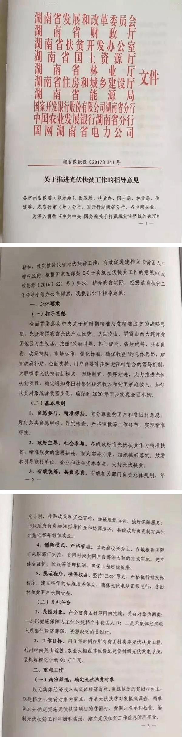 索比光伏网讯:近日,湖南省发改委、财政厅、能源局、扶贫办及省国土、林业、电力、城建和国开行、农发行联合出台的《关于推进光伏扶贫工作的指导意见》指出,2017—2019年,湖南将用3年时间在建档立卡贫困村实施光伏扶贫工程,利用村内荒山荒坡、农业大棚或其他设施建设村级光伏发电系统,总装机规模约达90万千瓦,将实现全省在6924个贫困村全覆盖。