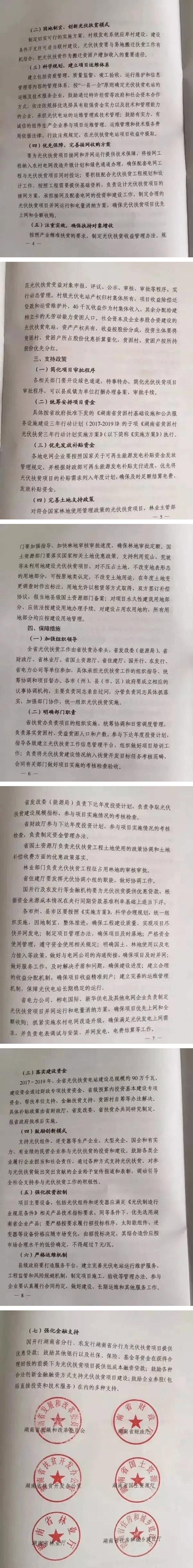 4、在金融扶持方面,国开行湖南省分行、农发行湖南省分行为光伏扶贫项目提供优惠贷款;鼓励其他银行及社保、保险、基金等资金在获得合理回报的前提下为光伏扶贫项目提供低成本融资贷款;鼓励各种合法创新金融融资方式支持光伏扶贫项目建设;鼓励企业参股(包括直接投资和技术服务)在内的多种支持。